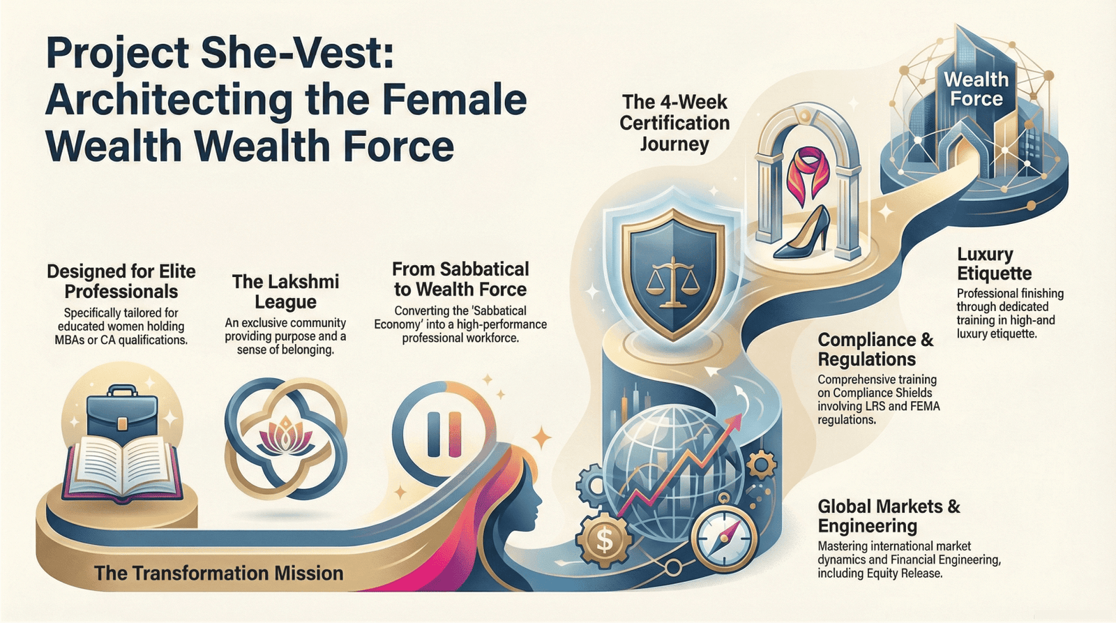Wealth Architect A 4-Week Program covering Global Markets, Financial Engineering (Equity Release), Compliance Shield (LRS/FEMA), and Luxury Etiquette.