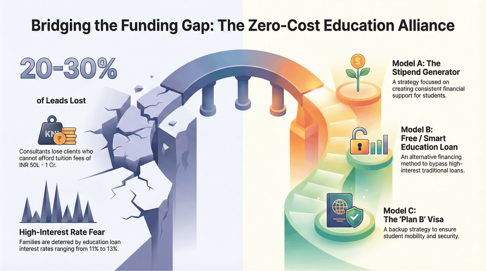 The Funding Gap Consultants lose 20-30% of leads because parents cannot afford INR 50L - 1 Cr tuition or fear 11-13% education loans.