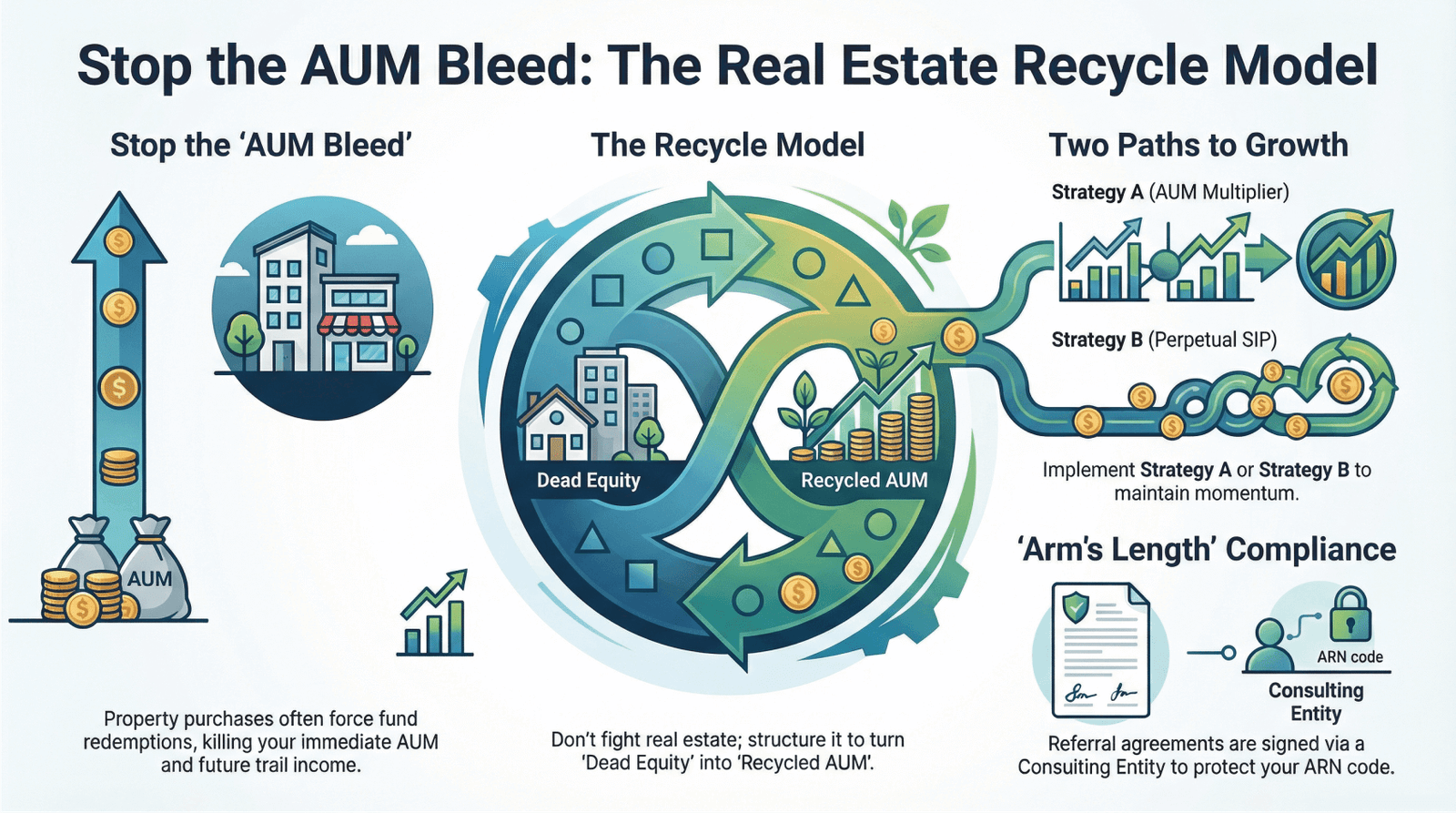 The AUM Bleed Real Estate is your enemy. When clients buy property, they redeem Equity Mutual Funds, costing you immediate AUM and future trail income.